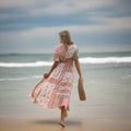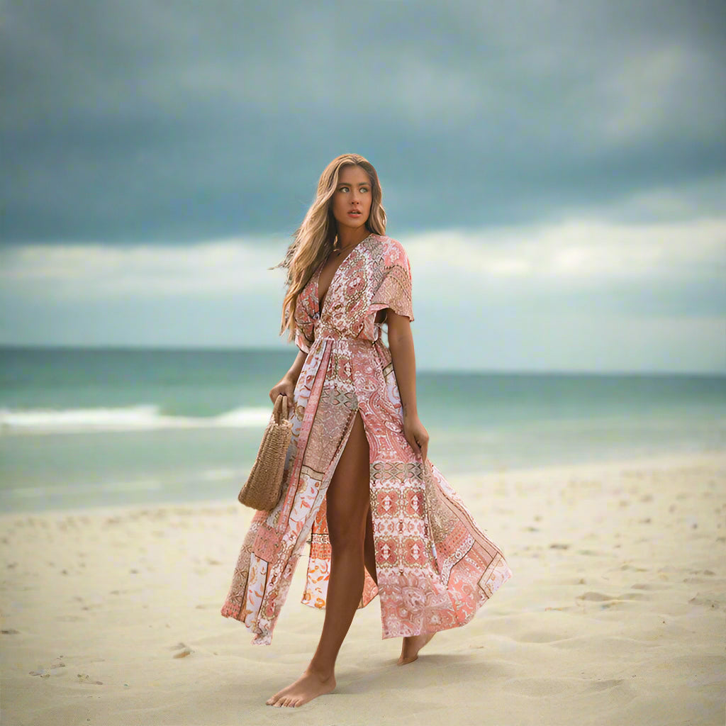 Embrace your inner bohemian goddess with this dress's relaxed and carefree silhouette. Its airy, lightweight fabric gently drapes around you as you stroll along the beach, offering a whimsical flair as a true work of art!
