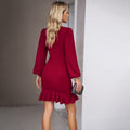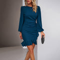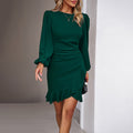 Women's Solid Color Bohemian Puff Sleeve Dress - Slim Fit Round Neck Long Sleeve Dress For Casual & Semi-Formal Occasions